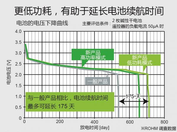 利用ROHM的模擬設(shè)計技術(shù)和電源系統(tǒng)工藝致力于降低消耗電流,在同等功能產(chǎn)品中消耗電流僅為業(yè)界最小級別的7µA,使干電池應(yīng)用的工作時間更長。這使2枚堿性干電池驅(qū)動的遙控器待機時(負(fù)載電流50µA)的續(xù)航時間比一般產(chǎn)品長約1.3倍(最長達(dá)175天)(ROHM調(diào)查數(shù)據(jù))。另外,電源IC由0.9V的低輸入電壓即可驅(qū)動,不僅支持紐扣型鋰電池,還可支持使用1枚干電池的應(yīng)用。而且還搭載了電池漏液檢測功能?偠灾,這是一款適用于干電池應(yīng)用的最佳電源IC。
