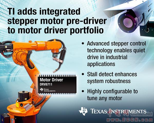 TI宣布推出首款集成型步進電機前置驅(qū)動器,進一步壯大其電機驅(qū)動器產(chǎn)品陣營。該DRV8711 支持同類最佳片上微步進分度器的高度可配置性,以及失速檢測與可便捷高效調(diào)節(jié)任何電機的高級電流調(diào)節(jié)功能。外部 MOSFET 可控制步進電機,支持最低熱耗散以及比性能最接近同類競爭產(chǎn)品高 20% 的可擴展輸出電流,允許設(shè)計人員自定義其設(shè)計。這款步進電機前置驅(qū)動器適用于各種工業(yè)應(yīng)用,包括紡織機械、視頻安全監(jiān)控、ATM 機、機器人、辦公自動化設(shè)備以及舞臺照明等。