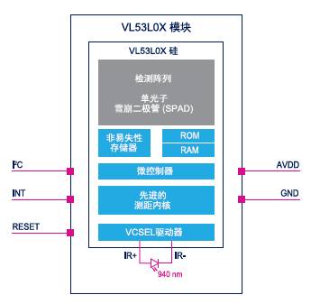 雪崩二極管)感應器陳列和一個符合人體一級安規(guī)的VCSEL(垂直腔面發(fā)射激光器)的集成940nm光源,與嵌入式微控制器上運行的算法一起使用時,可以直接確定以毫米為單位的目標物體的距離,即使是在具有挑戰(zhàn)性的工作條件下,并且與目標反射率無關。VL53L0X采用一個超低功耗的系統架構,非常適合用于無線和IoT應用。VL53L0X具有完整的文檔包,例如源代碼和軟件API(應用編程接口),它與廣發(fā)的微控制器和處理器兼容。