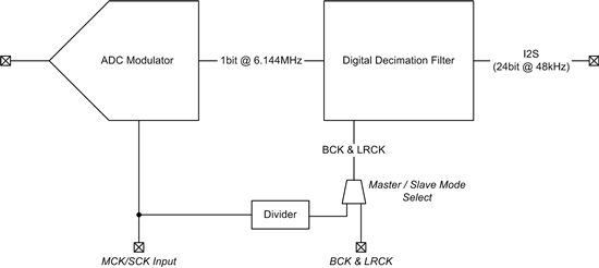 1 所示,高速主時(shí)鐘(例如:24.576 MHz 時(shí)鐘)用于驅(qū)動(dòng) ADC 的過采樣調(diào)制器。之后,來自過采樣調(diào)制器的數(shù)據(jù)被消減分解成 LRCK 給定的采樣速率。