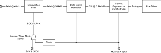 DAC 也是如此。 2 顯示了一個(gè)高級(jí) DAC 結(jié)構(gòu)圖。此處,需要通過 MCK/SCK 運(yùn)行內(nèi)插器,而 MCK/SCK 同時(shí)還驅(qū)動(dòng) △∑ 調(diào)制器。如果 MCK/SCK 不是采樣速率的整倍數(shù) (64/128/256/512),則在 △∑ 調(diào)制器輸出端可能會(huì)出現(xiàn)錯(cuò)誤數(shù)據(jù)。