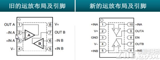 長時間工作的電子器件都會面臨散熱的問題,傳統(tǒng)音頻運放布局通常左右兩邊是不對稱的,所以,工程師們通常為左右不同的散熱方式而大傷腦筋。如下圖所示,傳統(tǒng)的運放布局的兩雙路運放設計是一個運放朝左,一個運放朝右,而且芯片內(nèi)部不是對稱放置。這樣當工作芯片發(fā)熱時,它的熱不是對稱著熱的,在音頻界如果器件不對稱發(fā)熱會使器件產(chǎn)生失真。