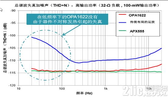 如上圖所示,傳統(tǒng)的運放由于不對稱發(fā)熱引起的失真會體現(xiàn)在這部分低頻時,就會有很大的THD+N的值。這部分對于真正愛好音頻和追求極致音質(zhì)的人來說這是絕對不能接受的,因為他會聽到諧波一直發(fā)聲。OPA1622特別的設計使得兩個運放在內(nèi)部就被設置好了,當發(fā)熱時這個影響就會被消除掉。