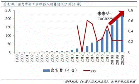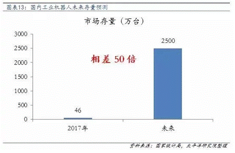根據(jù)國家統(tǒng)計局的數(shù)據(jù),我國有5000萬制造業(yè)職工,以每臺工業(yè)機器人替代2-3位工人來看,潛在存量市場會達到1800-2500萬臺,考慮到很多崗位還不能用機器人替代,可能實際市場并沒有這么大。我們與行業(yè)專家討論,五年內(nèi)可以看到國內(nèi)市場年銷量達到50-60萬臺。