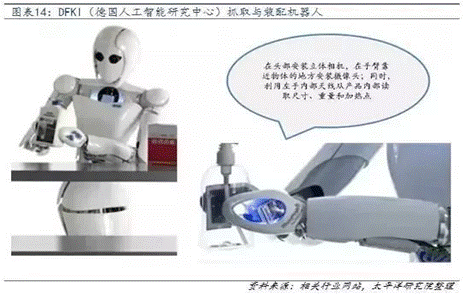 為了增加工業(yè)機器人的使用場景,使得機器人更加柔性化。DFKI(德國人工智能研究中心,是德國頂級的人工智能研究機構(gòu),也是目前世界上最大的非營利人工智能研究機構(gòu),其股東包括Google、Intel、 微軟、寶馬、SAP、Airbus在內(nèi)的全球前十的頂級科技企業(yè))研究出了智能抓取與裝配機器人,可以通過抽象記憶系統(tǒng)用于自適應(yīng)抓取與智能產(chǎn)品裝配,具體而言,就是在頭部安裝立體相機,在手臂靠近物體的地方安裝攝像頭;同時,利用左手內(nèi)部天線從產(chǎn)品內(nèi)部讀取尺寸、重量和加熱點。