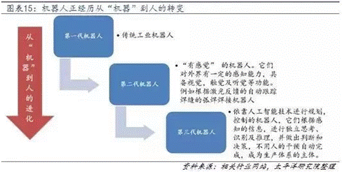 工業(yè)機器人代際演變:機器人正經(jīng)歷從“機器”到人的轉(zhuǎn)變。我們可以將機器人分為三代,第一代為傳統(tǒng)的工業(yè)機器人,其形態(tài)已經(jīng)接近50年未發(fā)生重大改變。第二代為“有感覺” 的機器人。它們對外界有一定的感知能力,具備視覺,觸覺及聽覺等功能。例如協(xié)作機器人、根據(jù)激光反饋的自動跟蹤焊縫的弧焊焊接機器人。第三代為依靠人工智能技術(shù)進行規(guī)劃,控制的機器人,它們根據(jù)感知的信息,進行獨立思考、識別及推理,并做出判斷和決策,不用人的干預(yù)自動完成,成為生產(chǎn)體系的主體,甚至可以替代機床等工作母機,例如云服務(wù)機器人。