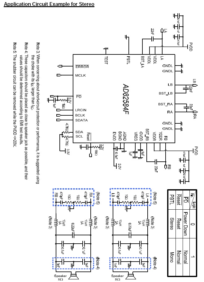 AD82584F is a digital audio amplifier capable of driving 25W (BTL) each to a pair of 8 load speaker and 50W (PBTL) to a 4 load speaker operating at 24V supply without external heat-sink or fan requirement with play music. AD82584F provides advanced audio processing functions, such as volume control, 30 EQ bands, audio mixing, 3D surround sound and Dynamic Range Control (DRC). These are fully programmable via a simple I2C control interface. Robust protection circuits are provided to protect AD82584F from damage due to accidental erroneous operating condition. The full digital circuit design of AD82584F is more tolerant to noise and PVT (Process, Voltage, and Temperature) variation than the analog class-AB or class-D audio amplifier counterpart implemented by analog circuit design. AD82584F is pop free during instantaneous power on/off or mute/shut down switching because of its robust built-in anti-pop circuit.