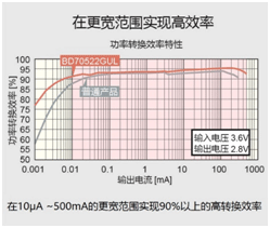 內(nèi)置低損耗MOSFET,負(fù)載模式搭載根據(jù)負(fù)載電流自動(dòng)無縫切換的Seamless Switching Mode Control (SSMC)功能,在消耗電流1µA以下的DC/DC轉(zhuǎn)換器中,在業(yè)界最寬范圍(10μA~500mA)實(shí)現(xiàn)90%以上的功率轉(zhuǎn)換效率。