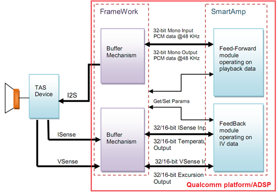 SmartPA主要是通過智能的保護(hù)算法實現(xiàn)對喇叭振幅和喇叭溫度的保護(hù),從而充分發(fā)揮喇叭的潛力,在有限的喇叭空間的情況下實現(xiàn)大音量和好音質(zhì)。這一部分TI的解決方案主要包括TAS2557, TAS2560TAS2559。對于單聲道方案而言,主要是內(nèi)置DSP的TAS2557和不帶DSP的TAS2560。對于內(nèi)置DSP的方案而言,保護(hù)算法是跑在芯片內(nèi)部的DSP上,所以實現(xiàn)相對而言更容易。那對于沒有DSP的方案來說,保護(hù)算法是需要跑在平臺端的DSP上,那本文主要就是針對這種應(yīng)用,介紹下TAS2560如何在高通平臺上使用。