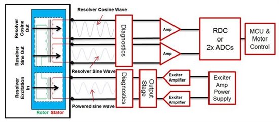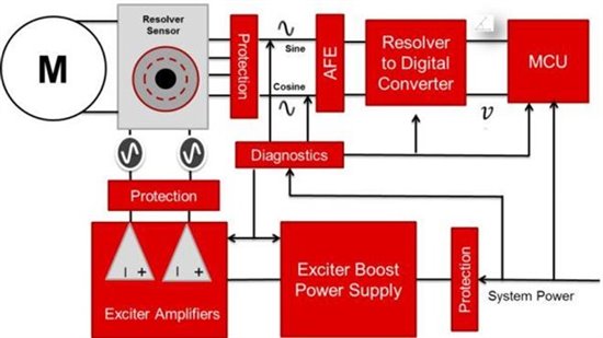 旋變的輸出是模擬信號,需要模擬前端(AFE)對信號進(jìn)行濾波、調(diào)整后,反饋給MCU進(jìn)行角度的計(jì)算。旋變數(shù)字轉(zhuǎn)換器(RDC)用來將正弦、余弦模擬信號轉(zhuǎn)換成數(shù)字信號。輸出端可以通過多種通信方式將位移、轉(zhuǎn)速信息傳遞給MCU,如SPI、并行接口、仿真編碼器接口、模擬接口等。最后,系統(tǒng)在傳感器和電子元件之間還需要多種保護(hù)和故障檢測功能,如過流保護(hù)、過壓保護(hù)、短路保護(hù)、過熱保護(hù)等。