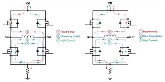 HR5561的H橋驅(qū)動部分采用低導(dǎo)通電阻的PMOS和NMOS功率管。低導(dǎo)