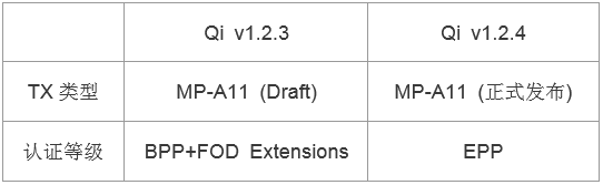 2. 在Qi v1.2.3版本下,該類發(fā)射端通過的是BPP+FOD Extensions認證,而在新發(fā)布的Qi v1.2.4下,對發(fā)射端認證等級進行了簡化,會通過EPP(MP-A11)認證。