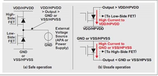 單電源 APA 在正電源(通常稱作 VDD  或 VCC)和基準(zhǔn)電壓之間運行。輸出 器件為一些帶主體二極管的 FET,其在正常運行中為反向偏置。如果這些二極 管中的一個變?yōu)檎蚱貌⑶覕y帶過大電流,則正常運行中為反向偏置的主體二 極管(請參見圖 1)就會被損壞。單電源 APA 被強制超出 VDD(或 VCC)以 上 0.3V 或者基準(zhǔn)電壓以下 -0.3V 時,出現(xiàn)這種情況。   圖 1  正向偏置主體二極管的電流傳導(dǎo)