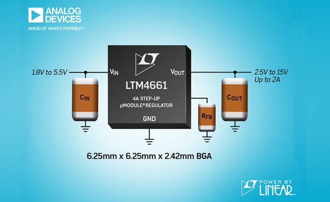 2018 年4月10日Analog Devices  (ADI) 宣布推出 Power by Linear™ LTM4661,該器件是一款采用 6.25mm x 6.25mm x 2.42mm BGA 封裝的低功率升壓型 µModule® 穩(wěn)壓器。只需少量的電容器和一個電阻器即可完成設(shè)計,而且解決方案的占板面積小于 1cm² (單面 PCB) 或 0.5cm² (雙面 PCB)。LTM4661 內(nèi)置了一個開關(guān) DC/DC 控制器、MOSFET、電感器和支持組件。LTM4661 在 1.8V 至 5.5V 的輸入電源范圍內(nèi)工作,而且在啟動之后可在低至 0.7V 的電壓條件下繼續(xù)運行。輸出電壓可利用單個電阻器設(shè)定在 2.5V 至 15V 的范圍內(nèi)。該器件采用小巧扁薄的封裝并具有寬輸入和輸出電壓范圍,因而成為眾多應(yīng)用的理想選擇,包括光學(xué)模塊、電池供電型設(shè)備、基于電池的備份系統(tǒng)、用于功率放大器或激光二極管的偏置電壓以及小型 DC 電機。