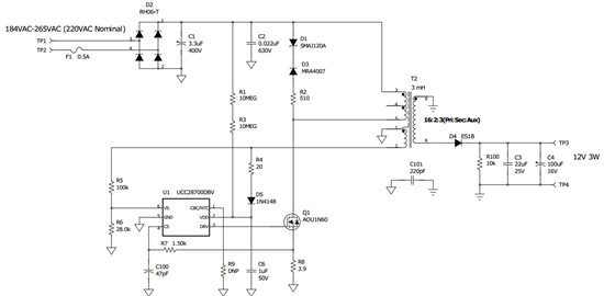 在圖 1 的實(shí)例中,要使用通用 AC 輸入(85VAC 至 264VAC)實(shí)現(xiàn) 12V/50mA 的偏置電源,需要為 R2 應(yīng)用 2kΩ 的最大電阻器。即便使用串聯(lián)電阻器,仍需補(bǔ)償 BJT 上的損耗,在輸入為 264VAC 時(shí)其可高達(dá) 5W。