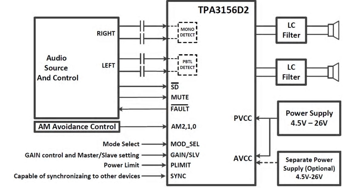 TPA3156D2模擬輸入D類放大器具有低空閑功率損耗,有助于延長藍牙/無線揚聲器和其他電池供電音頻系統(tǒng)的電池使用壽命。TPA3156D2器件的效率非常高,提供2×70W的功率,在雙層PCB上有外部散熱器。該器件集成了一種高效升壓模式,動態(tài)減小外部LC濾波器的電流紋波和空閑電流。TPA3156D2高級振蕩器/可編程鎖相環(huán)路 (PLL) 電路采用一個多重開關頻率選項來避免AM干擾。在實現(xiàn)此功能的同時,還有一個主器件或從器件選項,這使得多重器件同步成為可能。TPA3156D2器件具有短路保護和過熱保護以及過電壓、欠電壓和直流保護的全面保護,以防止發(fā)生故障。將故障報告回處理器,以防止器件在過載情況下受到損壞。