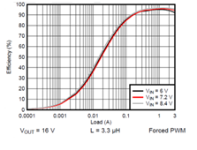 在不同輸入條件下,電感 3.3uH,輸出 16V 時(shí)的不同負(fù)載的效率曲線,最高可達(dá)96%,在自動(dòng) PFM/PWM 切換模式下,輕載效率也高達(dá)90%以上: