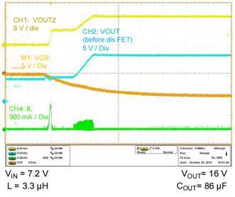 從上圖我們可以看到,所需要的外部器件很少。該芯片還提供一個(gè)單獨(dú)的 pin 腳 DISDRV 來(lái)驅(qū)動(dòng)負(fù)載輸出端的外部 FET(P-FET),在設(shè)備關(guān)斷或者輸出短路時(shí)它能完全斷開(kāi)輸入與輸出的連接。啟動(dòng)時(shí),通過(guò)內(nèi)部 55uA 的吸入電流源來(lái)控制外部 P-FET 開(kāi)關(guān)。同時(shí)具有短路保護(hù)功能,如果電感電流達(dá)到了短路保護(hù)電流限制閾值(典型值 20A),或者輸出電壓降低到了正常輸出值的70%,那么該芯片就會(huì)進(jìn)入間斷(hiccup)模式,關(guān)斷自己然后 90m 后重啟,這樣就能減小熱應(yīng)力。短路狀況消失后,系統(tǒng)會(huì)重啟并且進(jìn)入啟動(dòng)流程: