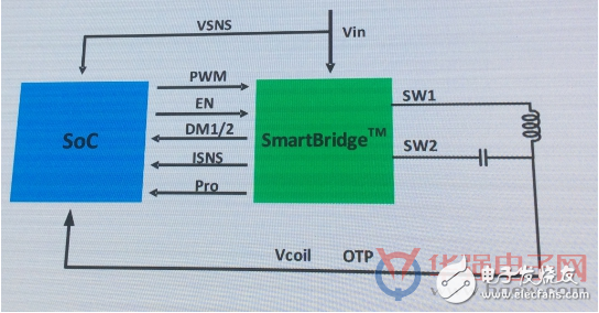 伏達(dá)推出的第一代Gen 1 TX解決方案自稱是世界上最為高度集成的TX解決方案,其方案主要由一顆控制芯片和一顆智能全橋芯片SmartBridge構(gòu)成。從下圖來看,整體方案確實(shí)簡潔。另外編者認(rèn)為,其中的智能全橋芯片可謂是該公司最具特色的產(chǎn)品。伏達(dá)把所有功率器件(包括4個MOSFET,4個Driver)都集成到SmartBridge中,因此其整個發(fā)射端系統(tǒng)由兩顆芯片就可以實(shí)現(xiàn),對下游產(chǎn)品工程師來說系統(tǒng)設(shè)計(jì)非常簡單。