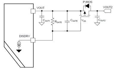 從上圖我們可以看到,所需要的外部器件很少。該芯片還提供一個單獨的 pin 腳 DIS來驅(qū)動負(fù)載輸出端的外部 FET(P-FET),在設(shè)備關(guān)斷或者輸出短路時它能完全斷開輸入與輸出的連接。啟動時,通過內(nèi)部電流源來控制外部 P-FET 開關(guān)。在關(guān)斷或者輸出短路時,將輸出與輸入側(cè)隔離,如下圖: