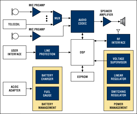 助聽器的原理大致為通過"麥克風"將聲音信號轉(zhuǎn)化為電信號,通過信號放大與處理電路,再用"受話器"將電信號又轉(zhuǎn)換為聲音信號。數(shù)字電位器MAX5395在方案中主于音量調(diào)節(jié),通過主控檢測按鍵操作來調(diào)整功放增益電阻,從而調(diào)節(jié)輸出音量。