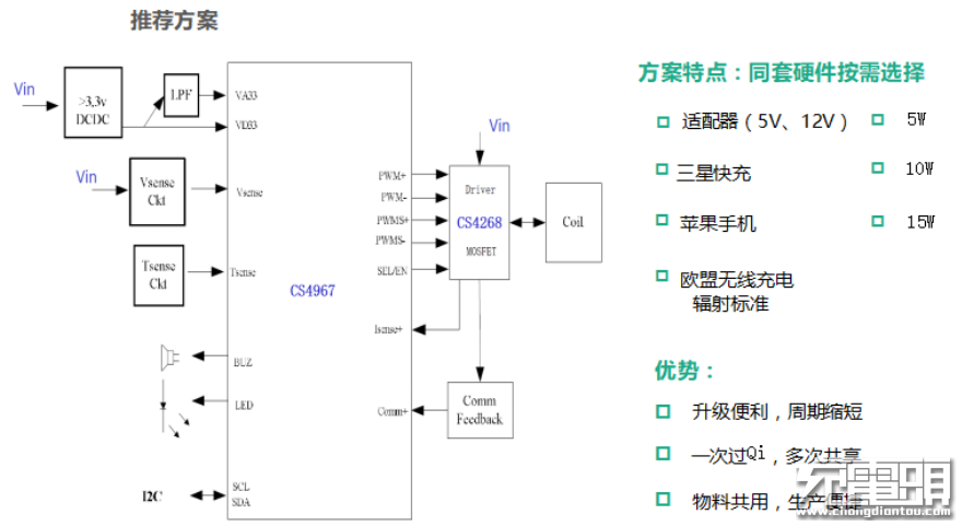 近日,推出一款5W~7.5W~10W~15W多合一解決方案,采用:CS4967(主控)、CS4268(驅(qū)動)、CS78S33(LDO)。方案外圍簡潔,符合WPC QI標(biāo)淮及歐盟EMC測試新規(guī),支持常規(guī)5V及QC快充輸入。
