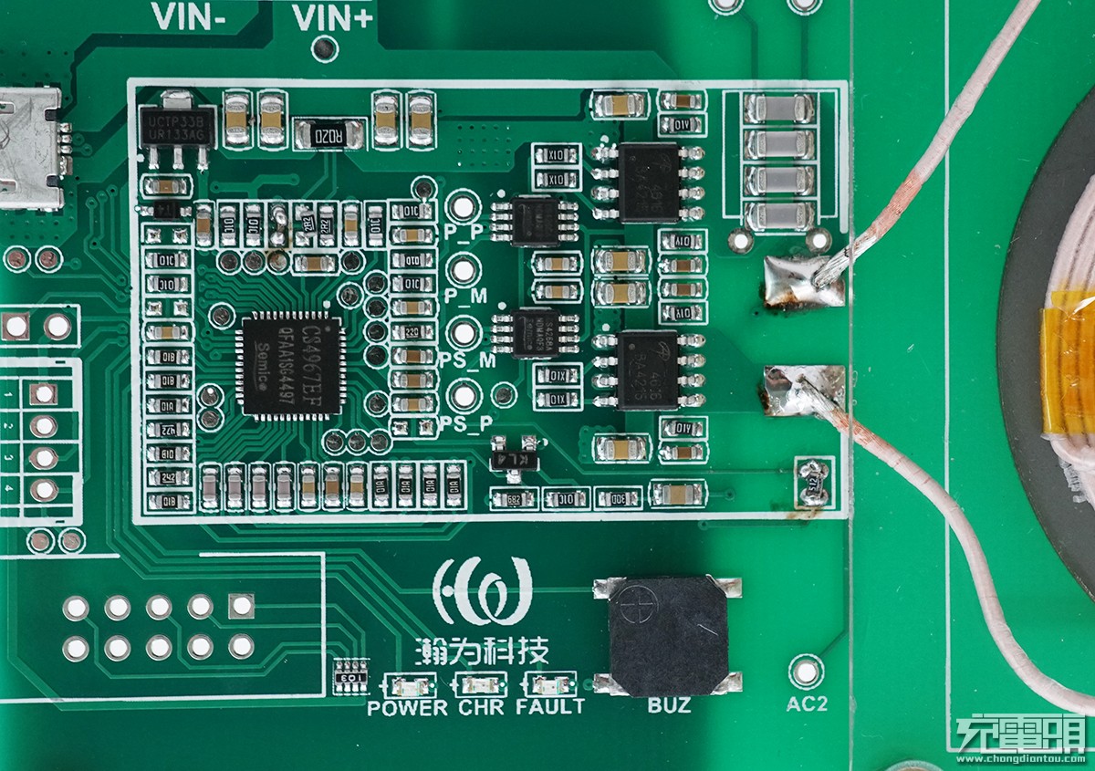 從搭載CS4967的DEMO板外觀來看,除主控IC之外,僅需要配備一顆供電轉(zhuǎn)換IC、兩個線圈驅(qū)動MOS及MOS驅(qū)動IC,搭配一些電阻電容及LED指示燈即可實現(xiàn)無線充電發(fā)射功能,板面元器件面布局非常簡潔,大大降低后續(xù)產(chǎn)品的BOM成本。