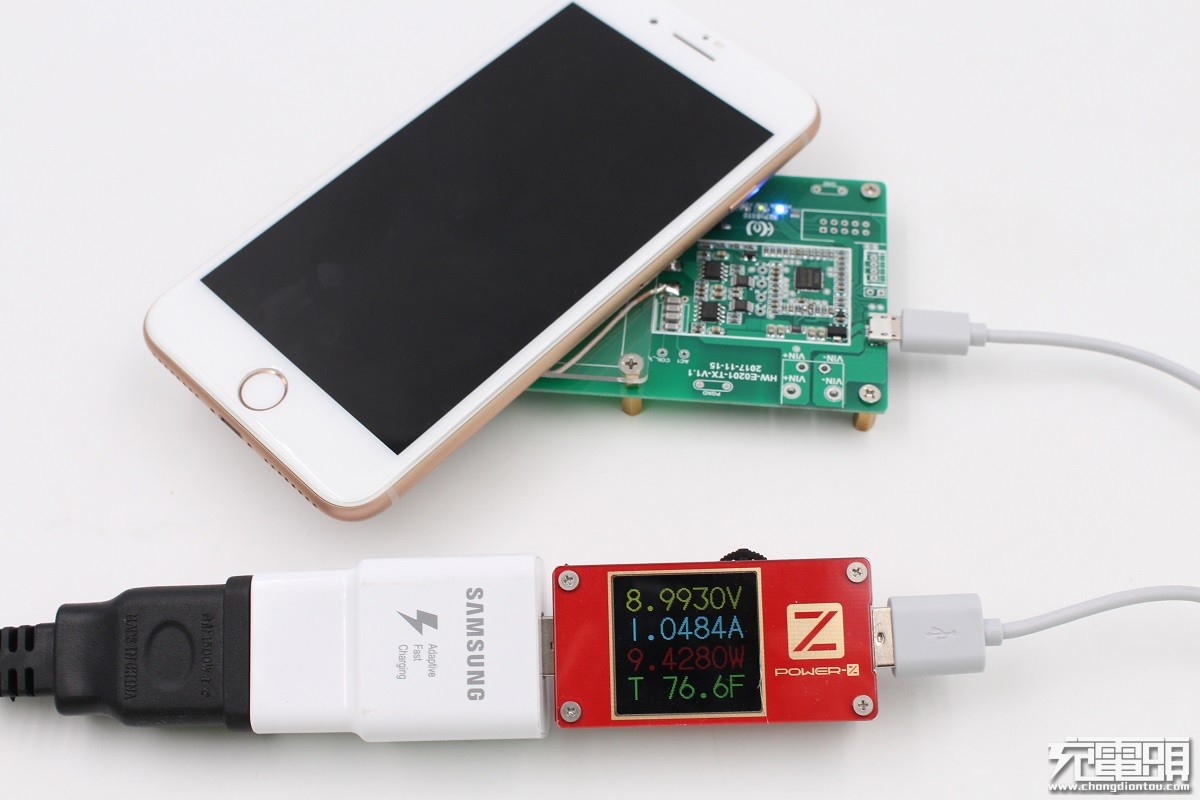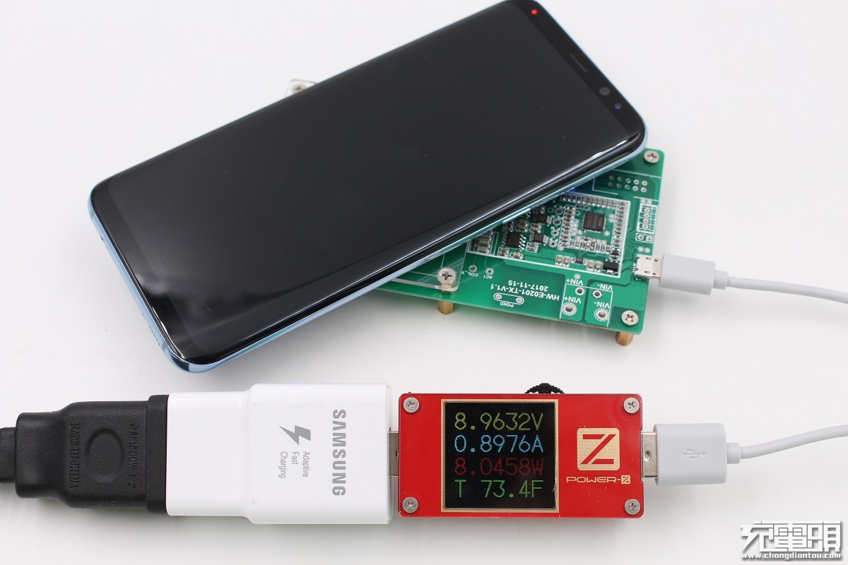 CS4967 DEMO板給三星S8+ (剩余10%電量)實測,ChargerLAB POWER-Z KT001顯示DEMO輸入端電壓8.96V,電流0.89A,功率8.04W,支持三星S8+無線快充。