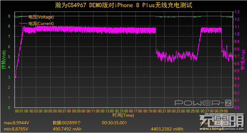 使用CS4967的DEMO板對iPhone 8 Plus(剩余電量20%起)進行30分鐘無線充電監(jiān)測,測試工具為ChargerLAB POWER-Z KM001,從截圖可以看到,充電前20分鐘內(nèi),充電電壓穩(wěn)定在9V左右,電流穩(wěn)定在1A以上,期間電流雖出現(xiàn)過波動,但功率仍維持在6W以上。