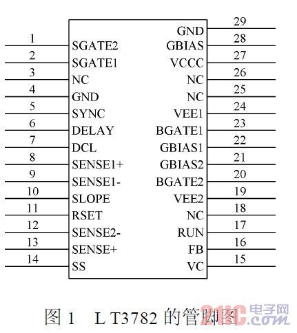 LT3782是美國凌力爾特公司生產(chǎn)的兩相步進(jìn)升壓型DC/DC控制器,28引腳SSOP封裝芯片,開關(guān)頻率在150~500kHz之間可編程,由于采用兩相BOOST拓?fù)浣Y(jié)構(gòu)。對(duì)輸出場(chǎng)效應(yīng)管漏電流和肖特基二極管通過電流的要求都減少一半,即兩個(gè)輸出相位差180°,兩個(gè)輸出間互相抑制輸出紋波電流,輸出紋波是單相BOOST轉(zhuǎn)換電路的1/3。電源效率高,對(duì)散熱的要求小。圖1是LT3782的管腳圖,第29引腳是芯片底部的散熱腳。27引腳連接輸入電源;4引腳接地;11引腳用來設(shè)定開關(guān)頻率;20和23BGATE引腳用來驅(qū)動(dòng)場(chǎng)效應(yīng)管的柵極;8,9,12和13SENSE引腳用來反饋場(chǎng)效應(yīng)管的輸出電流;16引腳是輸出電壓反饋引腳,該腳電壓為2.44V,通過反饋電阻可以設(shè)定輸出電壓值。17引腳是低電壓關(guān)斷引腳,當(dāng)該引腳的電壓大于2.45V時(shí),器件才開始工作,當(dāng)該引腳的電壓小于0.3V時(shí),器件進(jìn)入低電壓關(guān)斷模式。14引腳是軟啟動(dòng)引腳,當(dāng)加電時(shí),輸出電壓從0V漸變到設(shè)定的輸出電壓值,典型的啟動(dòng)時(shí)間可以由下式計(jì)算: