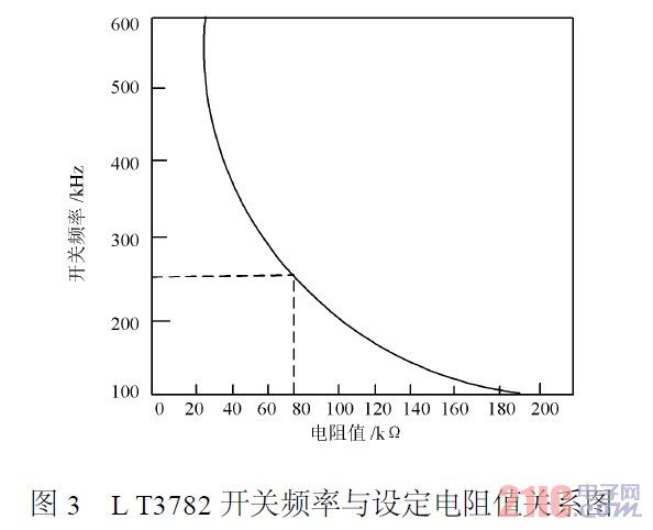 圖2中,電阻R1用來設(shè)定LT3782的開關(guān)頻率,LT3782的開關(guān)頻率在150~500kHz之間可編程。這里選取開關(guān)頻率為250kHz,參照?qǐng)D3取電阻值R1=75kHz。