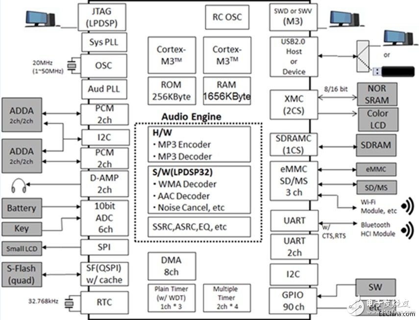 它們可以用于耳塞以提供32位、192千赫的性能,并在不大的尺寸范圍內(nèi),采用一個(gè)MP3編碼器、解碼器用于MP3、WMA和AAC格式,及一個(gè)D類音頻放大器、異步采樣率轉(zhuǎn)換器和一個(gè)六波段均衡器。