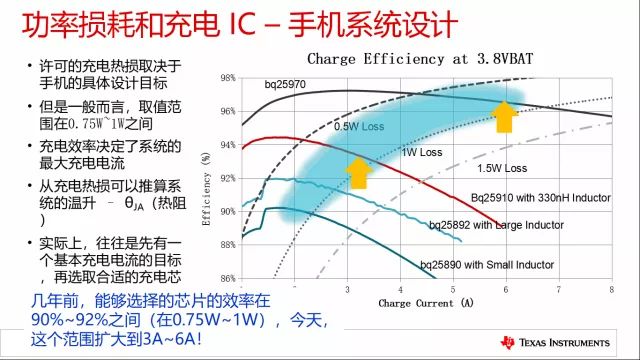 從TI的芯片數(shù)據(jù)來(lái)看,早一代芯片產(chǎn)品是黃色線條,新產(chǎn)品是藍(lán)色線條?梢钥吹剑什,損耗會(huì)更高,如果效率提高2.5%,在同等的熱損要求下,電流提升可以達(dá)到27%。即基本上1%的效率提升能夠允許10%的電流提升。提高效率,能較大幅度的提升許可充電電流上限,從而帶來(lái)更大的充電設(shè)計(jì)自由度!