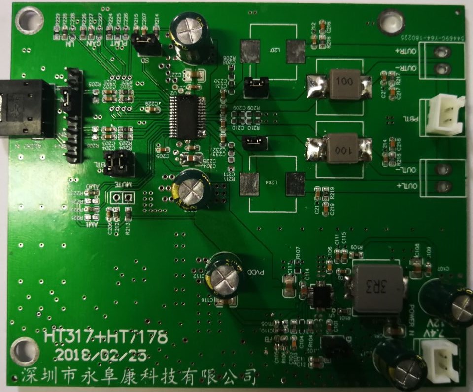 2,采用HT317 D類音頻功放IC,20V提供52W/4歐 ( THD+N=10%)持續(xù)功率輸出;