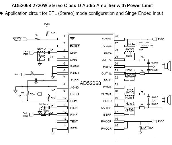 The AD52068 is a high efficiency stereo class-D