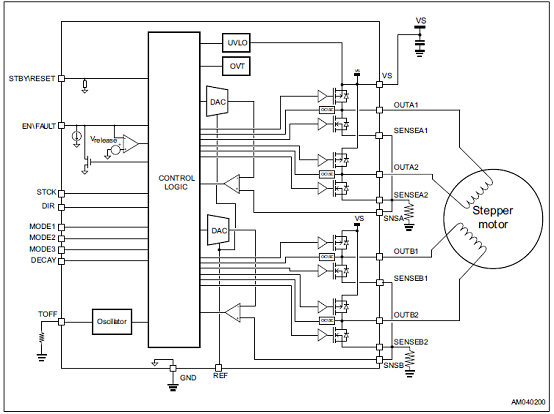 The microstepping resolution can be easily set toone of eight available values through M1, M2 andM3 inputs: full-step, 1/2, 1/4, 1/8, 1/16, 1/32,1/128 and 1/256 of step.It is simply controlled through step and directionports and embeds the PWM current controlalgorithm with selectable decay mode (fast + slowor slow) and the adjustable reference voltagelevel through an embedded potentiometer.