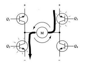 當(dāng)三極管Q2和Q3導(dǎo)通時(shí),電流將從右至左流過(guò)電機(jī),從而驅(qū)動(dòng)電機(jī)沿另一方向轉(zhuǎn)動(dòng)(電機(jī)周圍的箭頭表示為逆時(shí)針?lè)较?。
