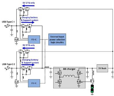 不過,目前具有兩個或多個USB-C端口的系統(tǒng)架構(gòu)很復(fù)雜,不能滿足很多客戶的要求。本白皮書提出了一種全新的系統(tǒng)架構(gòu),該架構(gòu)采用Intersil的ISL95338降壓-升壓穩(wěn)壓器和ISL95521A組合式電池充電器。我們將討論這種架構(gòu)如何簡化設(shè)計(jì),并全面支持所有USB-C功能。我們還將說明這種架構(gòu)如何應(yīng)用到適配器端,以實(shí)現(xiàn)可編程電源(PPS),這種電源可以輸出可調(diào)節(jié)電壓,以匹配USB-C的可變輸入電壓。