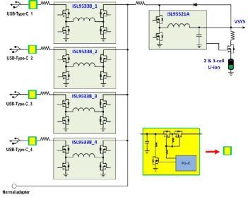 圖3. 實(shí)現(xiàn)4個USB-C端口的Intersil電池充電器架構(gòu) - 4個降壓-升壓穩(wěn)壓器+1個降壓充電器
