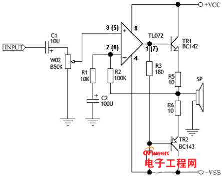 圖中的運算放大器IC1於同相輸入放大器,將輸入信號從可變電位器VR1的滑動觸頭連至其同名端(+)。電阻R3和R4有兩個功能:第一功能前面已經(jīng)說過,就是強制運算放大器工作在甲類狀態(tài);第二個功能是為TR1和TR2所組成的輸出級提供偏壓。