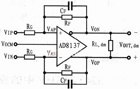 圖3是AD8137的一個(gè)典型連接電路,該電路采用外部RF/RG匹配網(wǎng)絡(luò)。其差分輸入端VAP和VAN作為求和點(diǎn),加到VOCM端的外部參考電壓可決定輸出共模電壓。同時(shí),兩個(gè)輸出端以平衡方式輸出的VOP和VON與其輸入信號(hào)相對(duì)應(yīng)。