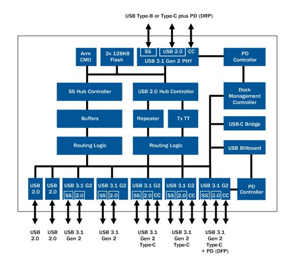 USB-C擴展塢的設(shè)計非常復(fù)雜,需要兩個USB Hub 來實現(xiàn)內(nèi)部和外部的連接,支持 USB PD 充電的每一個USB-C端口都需要一個專用控制器,以及一個USB Billboard、USB-C橋接控制器來報告運行狀態(tài)和連接失敗的情況。EZ-USB HX3PD Hub 控制器集成以上這些芯片的功能,從根本上簡化了系統(tǒng)的設(shè)計。此外,它還采用了12毫米×12毫米的封裝,從而減少了芯片面積。該控制器包括一個七端口 10-Gbps的 USB 3.1 Gen 2 Hub、兩個支持USB PD 3.0充電的USB-C端口以及一個支持USB Billboard 功能和安全固件下載的擴展塢管理控制器。該控制器具備可編程特性,從而使設(shè)計人員能夠緊跟USB-C和USB PD規(guī)范的更迭,并且更好地解決相關(guān)的互操作性問題。該控制器還集成了一個可配置的USB PHY以防止USB信號的衰減,從而提高信號質(zhì)量、滿足乃至超過USB協(xié)議的要求。