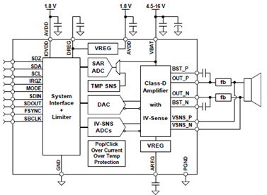 Integrated speaker voltage and current senseprovides for real time monitoring of loudspeakerbehavior. A battery tracking peak voltage limiter withbrown out prevention optimizes amplifier headroomover the entire charge cycle of 2S or 3S batterysystems.Up to eight devices can share a common bus viaeither I2S/TDM + I2C.