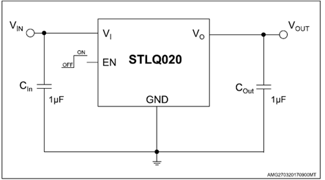 The STLQ020 is a 200 mA low-dropout voltage regulator, able to work with an input voltage ranging from 2 V to 5.5 V. The typical dropout voltage at maximum load is 160 mV. The ultra-low quiescent current, which is just 0.3 μA at no load on the adjustable version, extends battery-life of applications requiring very long standby time.