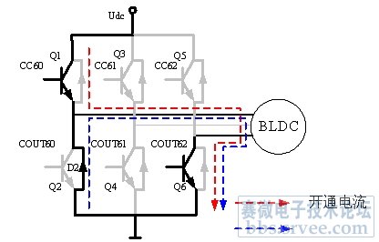 設(shè)計(jì)變頻驅(qū)動(dòng)電路可有以許多不同的方式。在典型的三相電機(jī)中,最流行的低頻驅(qū)動(dòng)方案是梯形波驅(qū)動(dòng)電路,如圖1所示。圖2給出了梯形波驅(qū)動(dòng)電路的實(shí)際測(cè)試波形。