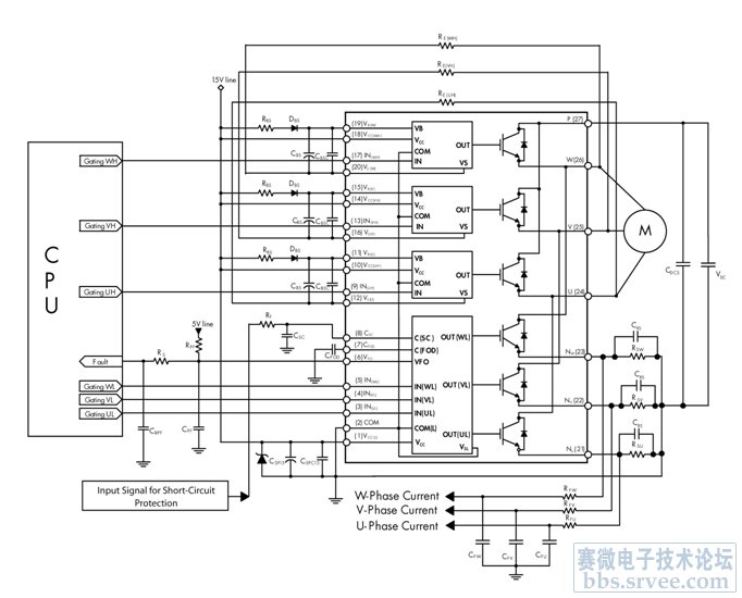 智能功率模塊(SPM)是微控制器或DSP與電機(jī)之間的功率接口,能減小電機(jī)體積并簡(jiǎn)化設(shè)計(jì)。這種模塊較之于分立式解決方案的優(yōu)勢(shì)在于寄生電感更小、可靠性也更高,這是因?yàn)槟K內(nèi)的所有功率器件都采用了同批次芯片,具有一致的測(cè)試性能。這種智能功率模塊可與微控制器低電壓TTL或CMOS輸出直接接口,并帶有保護(hù)電路。模塊內(nèi)置有監(jiān)視結(jié)溫的熱敏電阻器、防止上下橋臂直通的邏輯保護(hù)電路、死區(qū)時(shí)間控制,以及用于最大限度減少EMI等的驅(qū)動(dòng)波形整形電路。在模塊中,每個(gè)驅(qū)動(dòng)IC均可進(jìn)行優(yōu)化,使其以最小的EMI和驅(qū)動(dòng)損耗來(lái)完成功率器件的開(kāi)關(guān)動(dòng)作。三相驅(qū)動(dòng)模塊將繼續(xù)在電器產(chǎn)品廣泛應(yīng)用。圖5給出了馬達(dá)控制使用 SPM 的典型應(yīng)用電路。