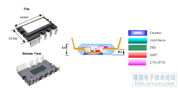 圖 6為采用Mini-DIP封裝的Motion-SPM智能功率模塊的外觀和內(nèi)部結(jié)構(gòu)示意。Motion-SPM是一款超小型功率模塊,它將功率元件、上下橋臂柵極驅(qū)動(dòng)器和保護(hù)電路全部集成在一個(gè)雙列直插式移模封裝件中,用于交流100~220V 等級(jí)低功耗電機(jī)驅(qū)動(dòng)變頻控制。