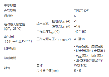 TPD7212F采用符合RoHS標(biāo)準(zhǔn)的WQFN32封裝,尺寸僅為5.0mm x 5.0mm,與其上一代產(chǎn)品相比,其安裝面積降低多達(dá)75%。該產(chǎn)品完全符合AEC-Q100汽車標(biāo)準(zhǔn),工作溫度為-40°C至+150°C。