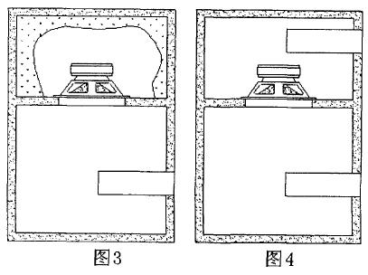 這種音箱比較少見,參見圖3、圖4,由圖可以看出,它是在閉箱與倒相式音箱的基礎(chǔ)上發(fā)展而來的。既有閉箱的設(shè)計(jì)痕跡,也有倒相式音箱的特征,其中圖3所示音箱也有稱四階帶通式音箱,圖4所示音箱可以稱之為六階帶通式音箱。
