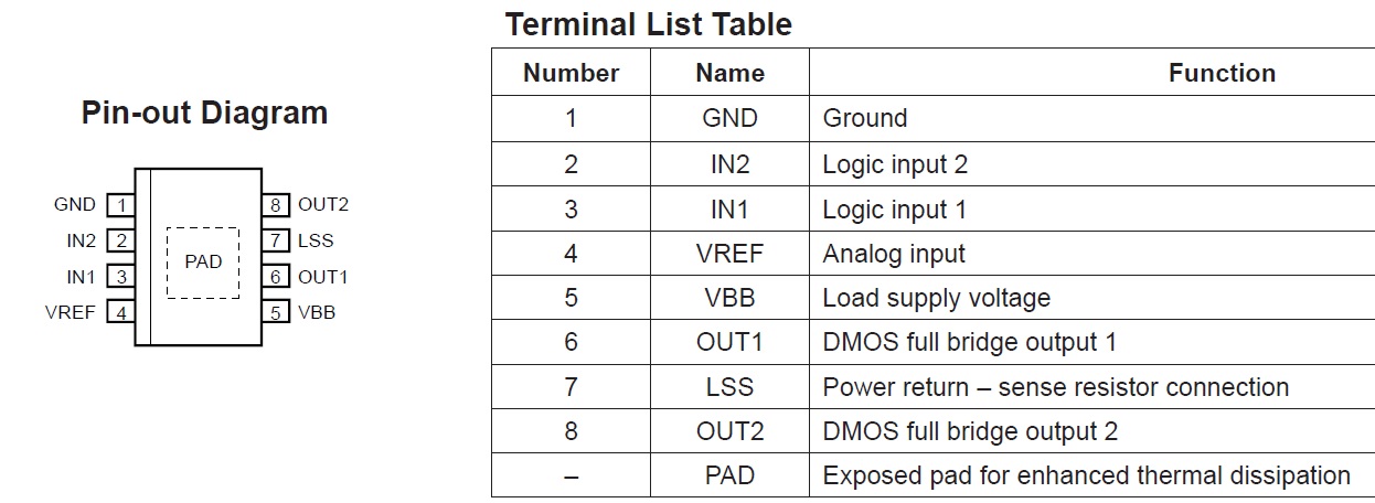 內(nèi)部電路保護包括過電流保護、電動機引腳接地短路或電源短路、帶時延的過熱關(guān)機、VBB 欠壓監(jiān)視以及交叉電流保護。